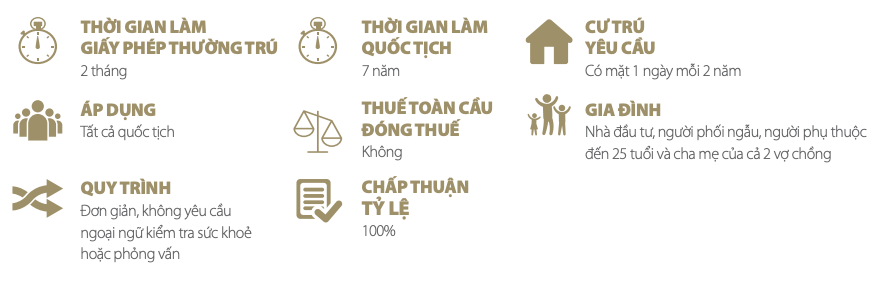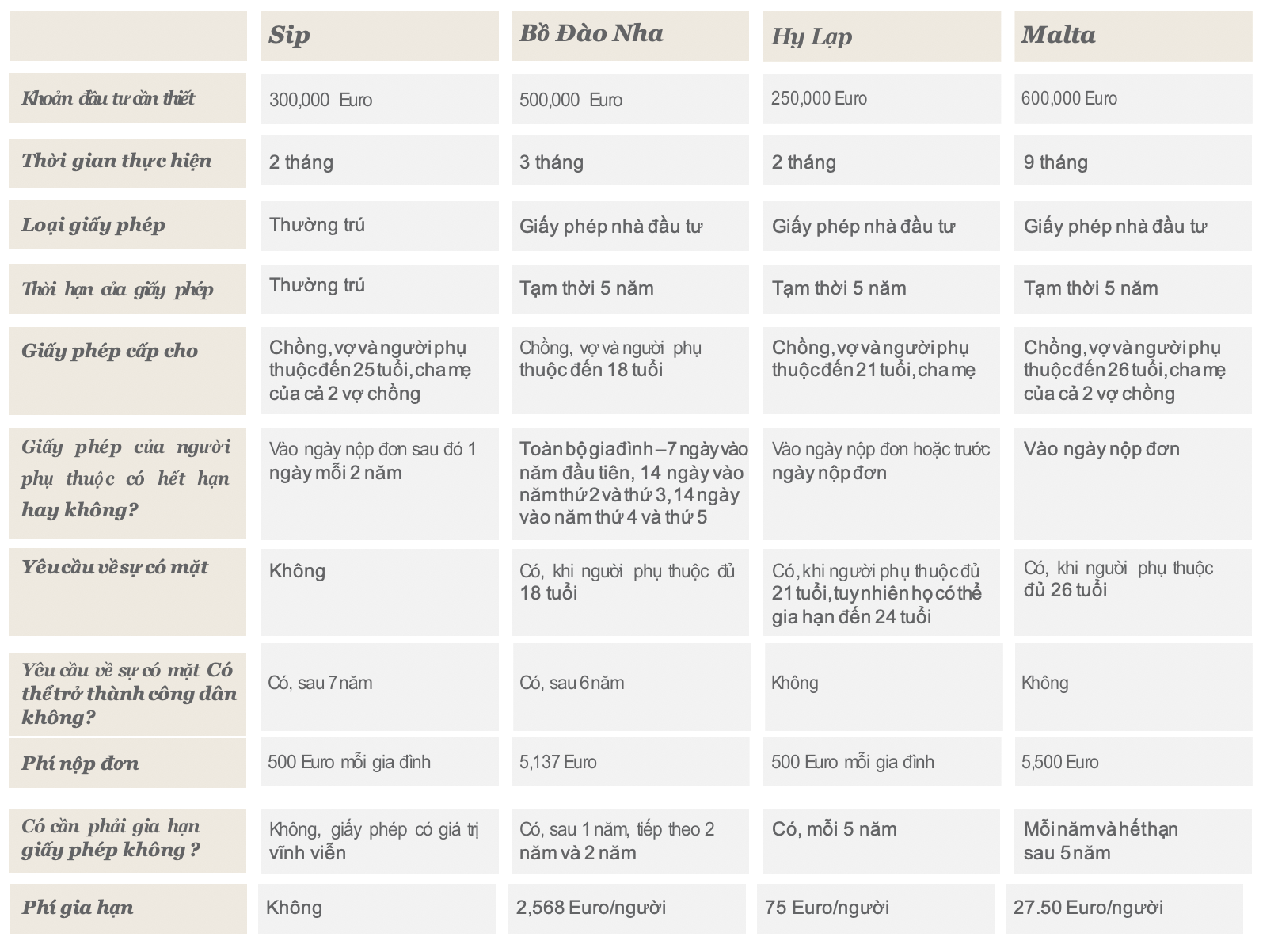khi Cyprus trở thành một quốc gia thành viên thuộc khối Schengen trong tương lai rất gần. Hòn đảo cung cấp nhiều cơ hội giáo dục tuyệt vời cho phép con cái của khách hàng có thể tiếp cận với nhiều trường đại học tốt nhất trên thế giới. Ngoài ra cũng cho phép khách hàng có quyền nộp đơn xin nhập quốc tịch Châu Âu sau 7 năm! “Tư cách Thường trú nhân cho phép gia đình khách hàng quyền tự do sinh sống ở các quốc gia trong khối EU và đi du lịch một cách dễ dàng, có điều kiện tiếp cận hệ thống giáo dục và chăm sóc sức khỏe ưu việt, hoặc chỉ đơn giản là cung cấp chính sách bảo hiểm cho một tương lai không chắc chắn!” |