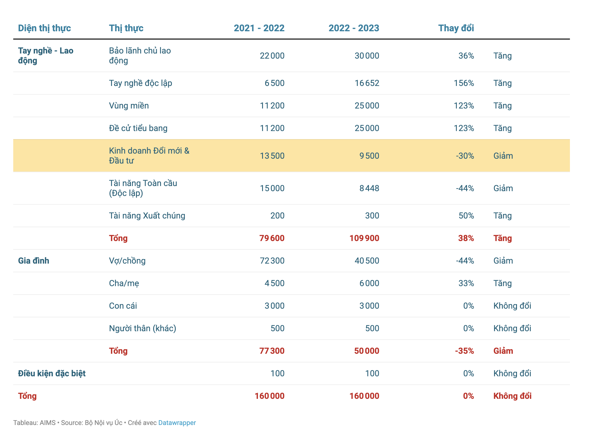 Số lượng thị thực định cư theo diện lao động - tay nghề, kinh doanh được phân bổ thêm 30.000 thị thực so với năm ngoái. Tuy nhiên, chủ yếu số lượng tăng này được dành cho các diện thị thực bảo lãnh vùng miền, bảo lãnh tiểu bang và chủ lao động bảo lãnh. Điều này cho thấy sự chú trọng của Bộ Nội vụ Úc đối với việc thu hút lực lượng lao động phù hợp với yêu cầu của từng khu vực và lĩnh vực để nhanh chóng vực dậy nền kinh tế Úc. Bên cạnh đó, cũng cần kể đến chương trình thị thực nông nghiệp mới được đưa ra cũng sẽ chiếm lượng lớn số lượng thị thực định cư trong năm 2022 - 2023.